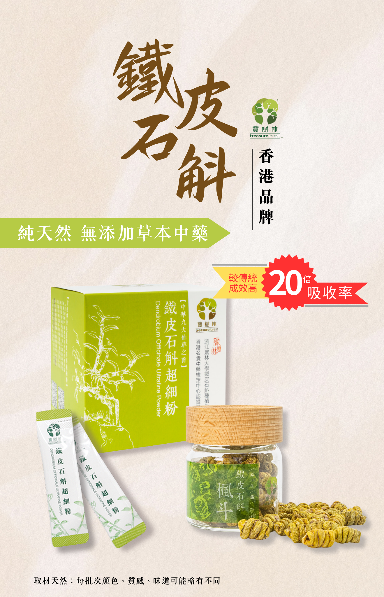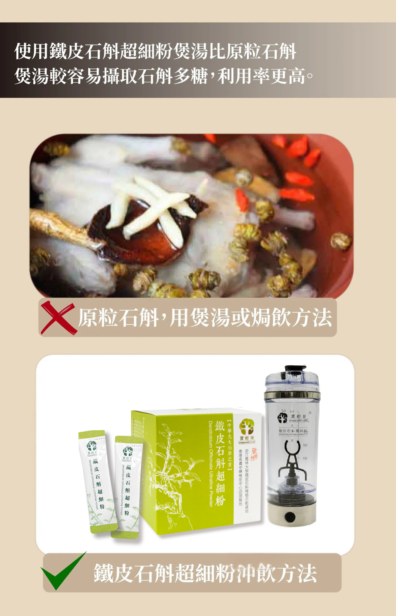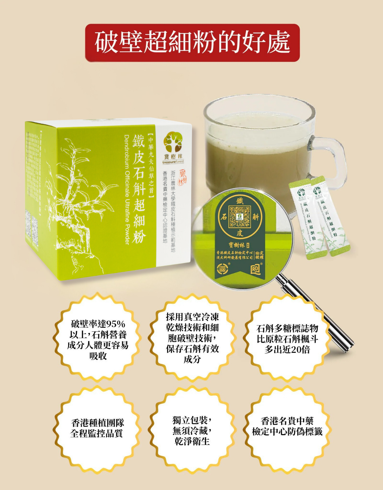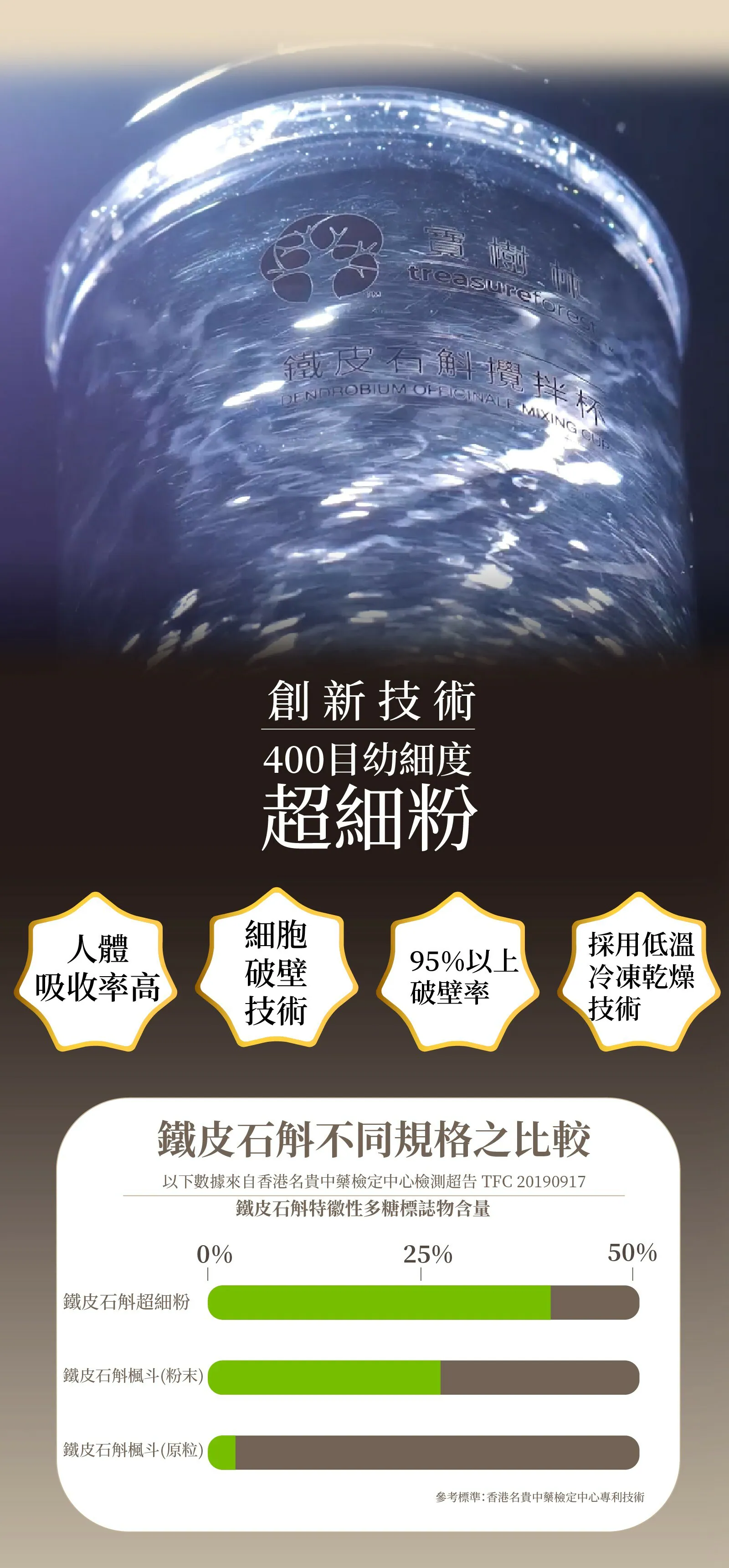 本產品選用寶樹林優質鐵皮石斛, 採用真空低溫冷凍乾燥技術, 細胞破璧技術, 超細粉達95%以上破壁率, 400目細度以上, 營養成分在未遭到破壞的情況下可以完全釋放出來, 提升藥力功效。